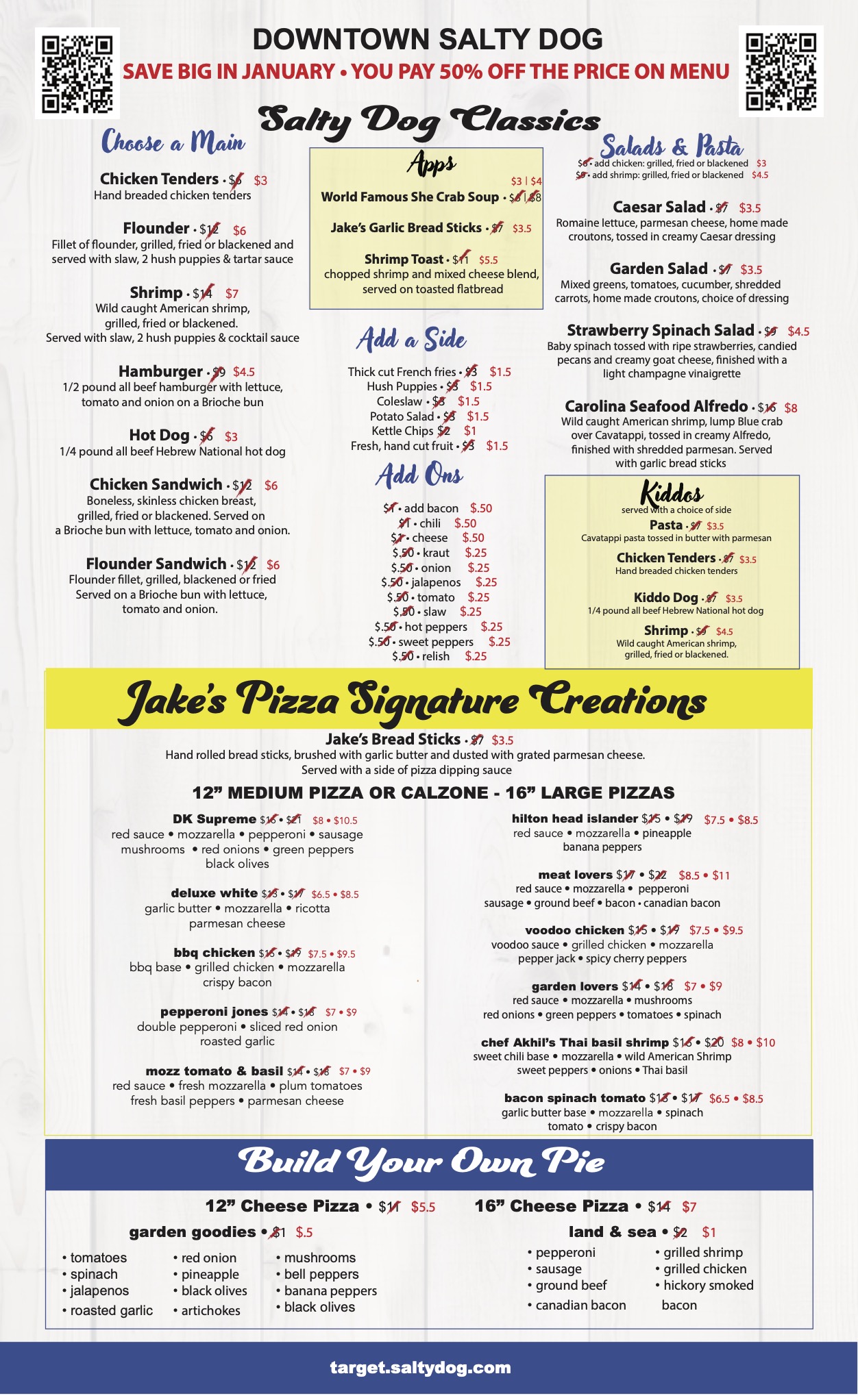 conveniently located off Palmetto Bay Road CELEBRATE WITH US! UNTIL JANUARY 31 50% OFF! MENU PRICES 6 TARGET ROAD LOCATION 1/2 lb Burger: 16" Pepperoni Pizza: Shrimp Basket: Kid's Pasta: Real Hand Spun Milkshake: Shrimp Toast: Spinach & Strawberry Salad: ☟ FULL MENU BELOW |