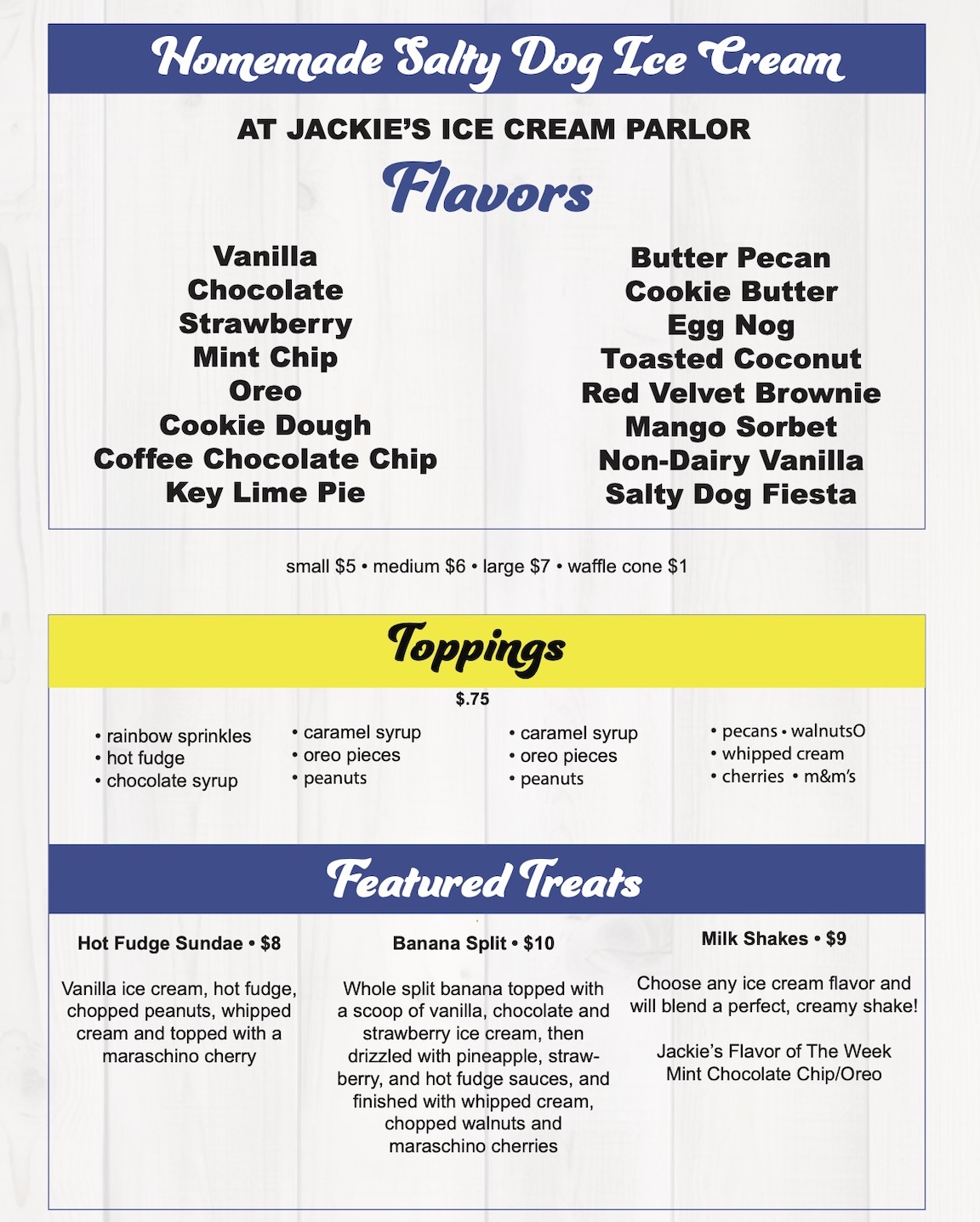 JACKIE'S HOMEMADE ICE CREAM & TREATS • VANILLA • • CHOCOLATE • • STRAWBERRY • • OREO • • MINT CHIP • • COOKIE BUTTER • • COFFEE CHOCOLATE CHIP • • BUTTER PECAN • • TOASTED COCONUT • • SALTY DOG FIESTA • • KEY LIME PIE • • VELVET BROWNIE • • EGG NOG • • NONDAIRY VANILLA / COCONUT BASE • • NONDAIRY MANGO SORBET • • HOT FUDGE SUNDAES • • HANDSPUN MILK SHAKES • • BANANAS SPLITS • • MORE ON THE WAY! • |